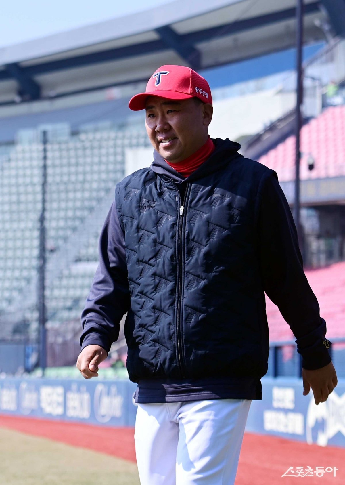 14일 서울 잠실야구장에서 열린 ‘2024 신한 SOL 뱅크 KBO리그’ 두산 베어스와 KIA 타이거즈의 시범경기에 앞서 KIA 이범호 감독이 선수들의 훈련을 지켜보고 있다.