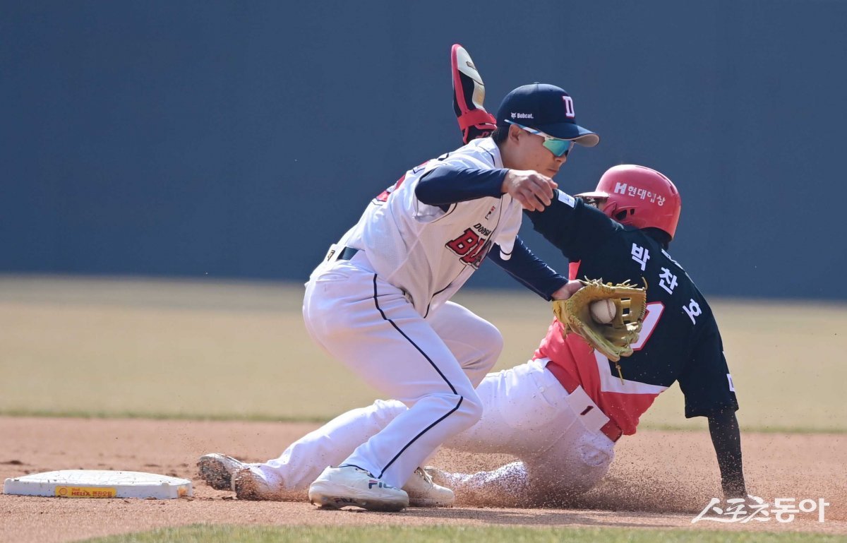 14일 서울 잠실야구장에서 열린 ‘2024 신한 SOL 뱅크 KBO리그’ 두산 베어스와 KIA 타이거즈의 시범경기에서 6회초 1사 1루 상황에서 두산 2루수 여동건이 KIA 1루주자에게 도루를 허용하고 있다.