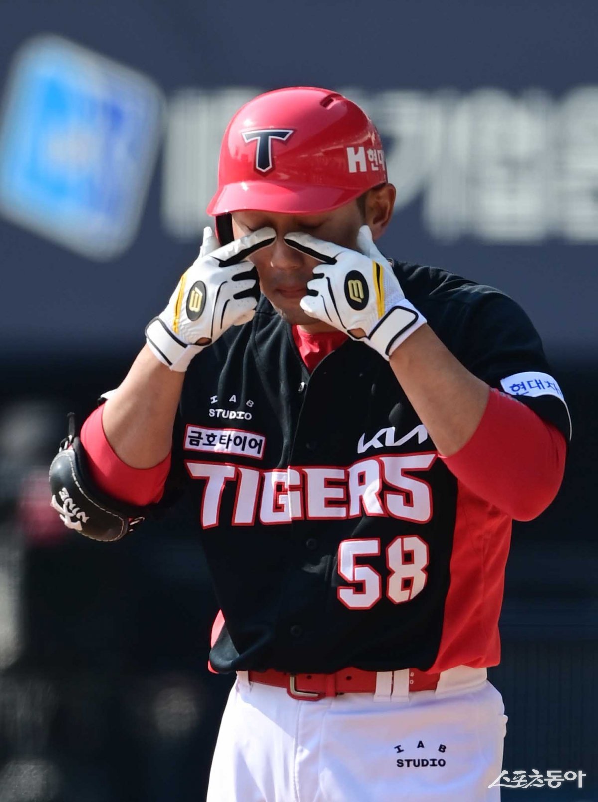 14일 서울 잠실야구장에서 열린 ‘2024 신한 SOL 뱅크 KBO리그’ 두산 베어스와 KIA 타이거즈의 시범경기에서 7회초 1사 1루 KIA 서건창이 눈을 비비고 있다.