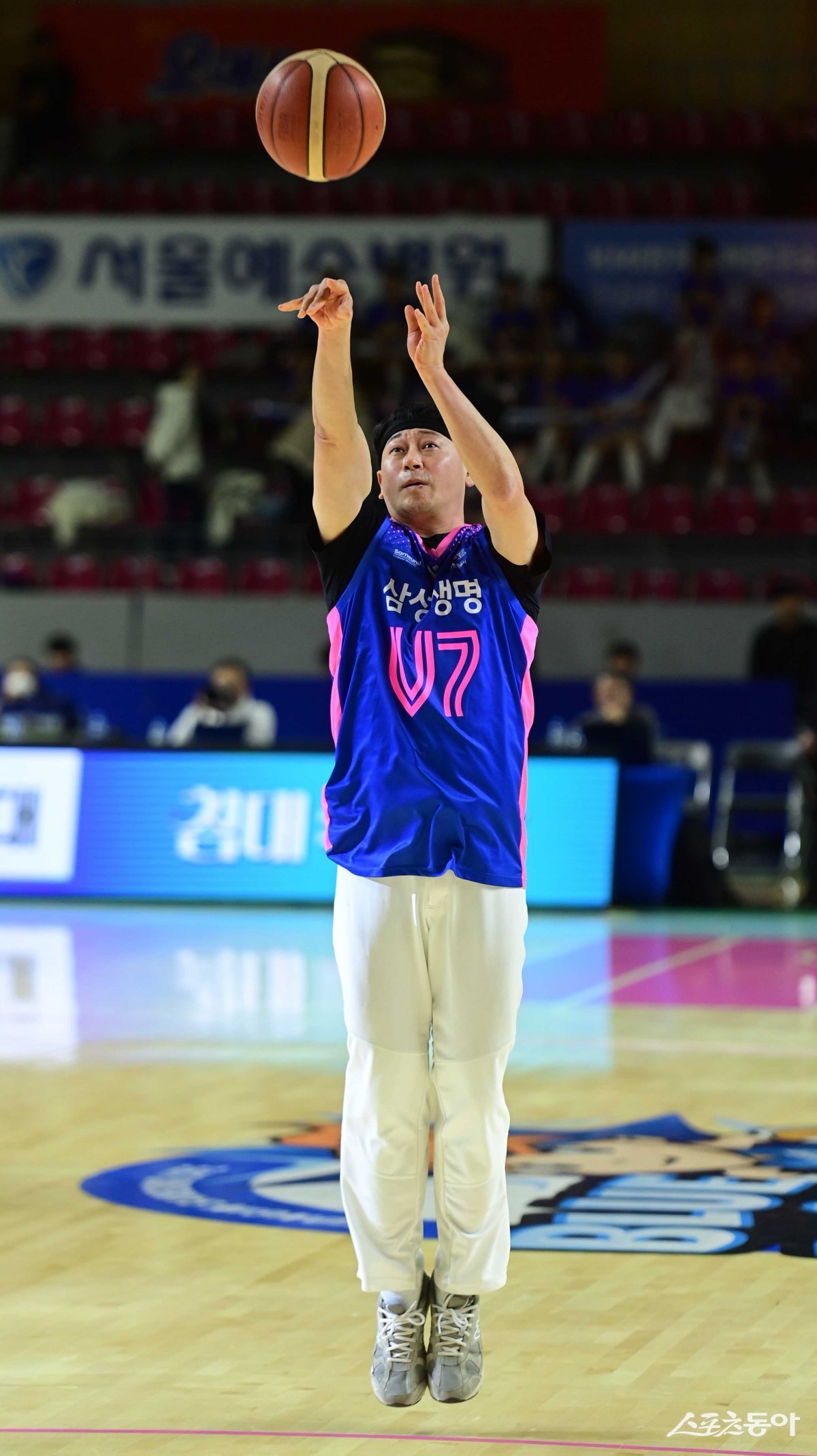 14일 경기도 용인실내체육관에서 열린 ‘우리은행 우리WON 2023-2024 여자프로농구’ 4강 플레이오프 3차전 용인 삼성생명과 아산 우리은행의 경기에 앞서 김주일 응원단장이 시투를 하고 있다.
