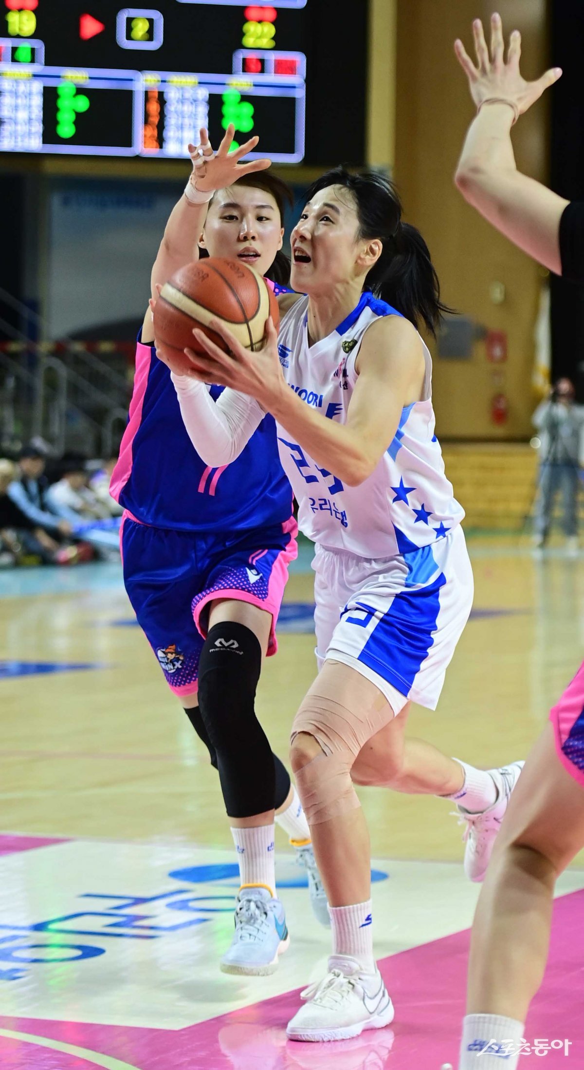 14일 경기도 용인실내체육관에서 열린 ‘우리은행 우리WON 2023-2024 여자프로농구’ 4강 플레이오프 3차전 용인 삼성생명과 아산 우리은행의 경기에서 우리은행 김단비가 삼성생명 수비를 뚫고 슛을 하고 있다.