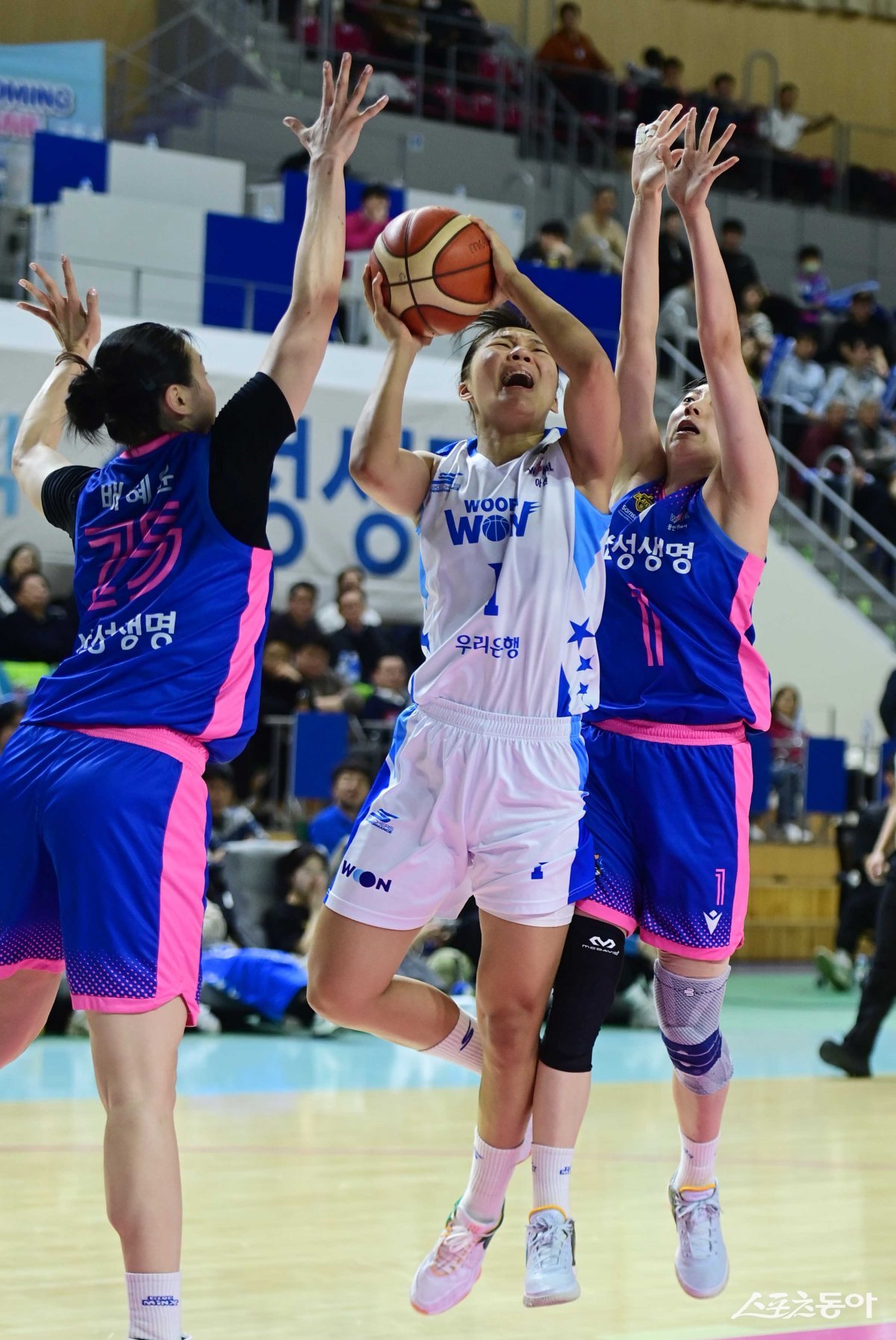 14일 경기도 용인실내체육관에서 열린 ‘우리은행 우리WON 2023-2024 여자프로농구’ 4강 플레이오프 3차전 용인 삼성생명과 아산 우리은행의 경기에서 우리은행 박지현이 삼성생명 수비 사이에서 슛을 하고 있다.