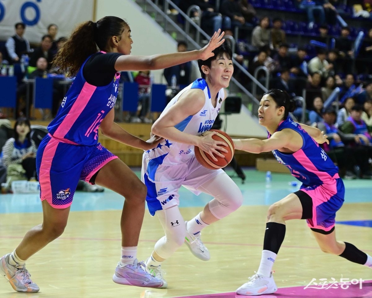 14일 경기도 용인실내체육관에서 열린 ‘우리은행 우리WON 2023-2024 여자프로농구’ 4강 플레이오프 3차전 용인 삼성생명과 아산 우리은행의 경기에서 우리은행 박혜진이 삼성생명 수비를 뚫고 골밑 돌파를 하고 있다.
