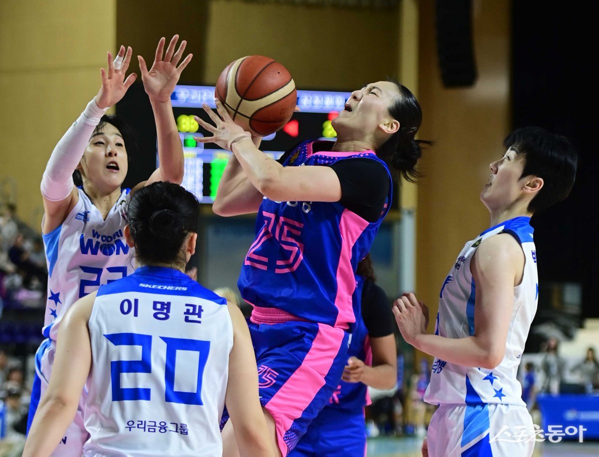 14일 경기도 용인실내체육관에서 열린 ‘우리은행 우리WON 2023-2024 여자프로농구’ 4강 플레이오프 3차전 용인 삼성생명과 아산 우리은행의 경기에서 삼성생명 배혜윤이 우리은행 수비 사이에서 슛을 하고 있다.