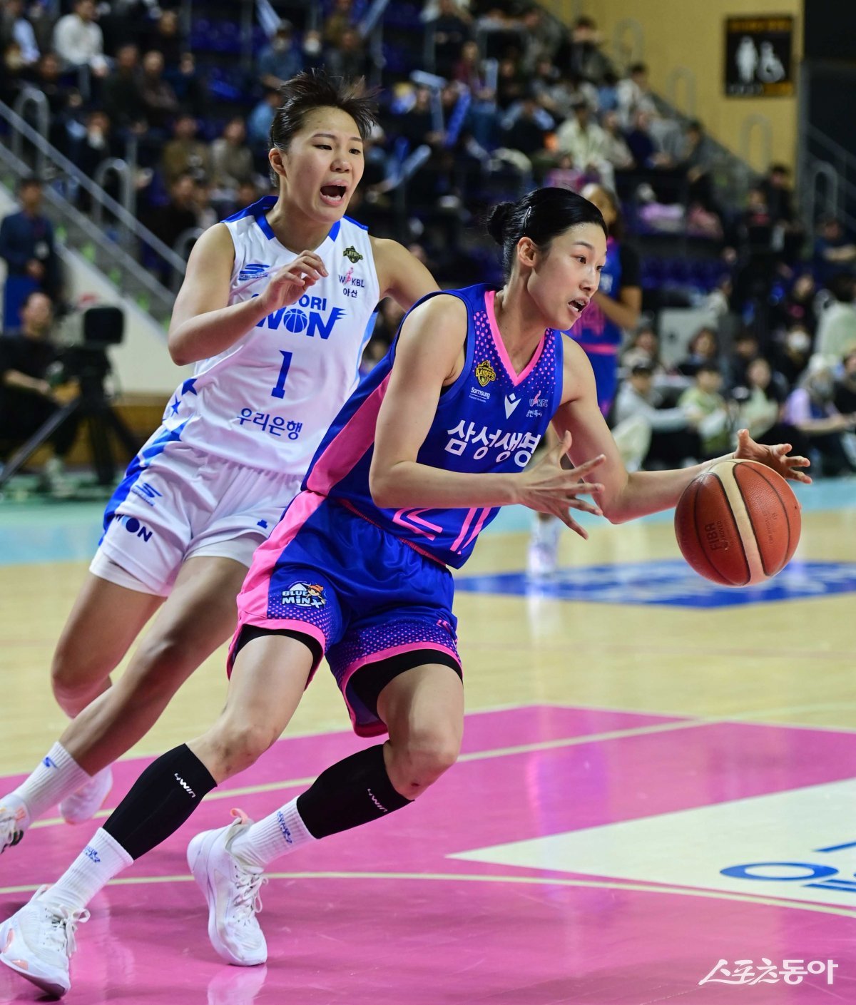 14일 경기도 용인실내체육관에서 열린 ‘우리은행 우리WON 2023-2024 여자프로농구’ 4강 플레이오프 3차전 용인 삼성생명과 아산 우리은행의 경기에서 삼성생명 이해란이 우리은행 박지현의 수비를 뚫고 골밑 돌파를 하고 있다.