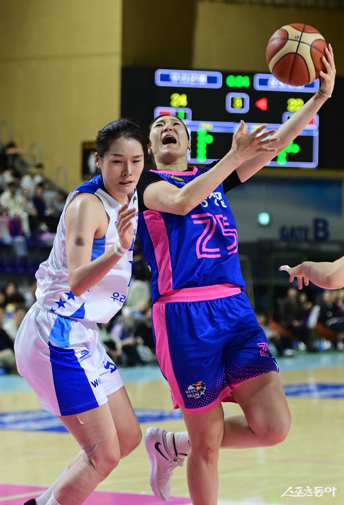 14일 경기도 용인실내체육관에서 열린 ‘우리은행 우리WON 2023-2024 여자프로농구’ 4강 플레이오프 3차전 용인 삼성생명과 아산 우리은행의 경기에서 삼성생명 배혜윤이 우리은행 최이샘의 수비를 뚫고 슛을 하고 있다.