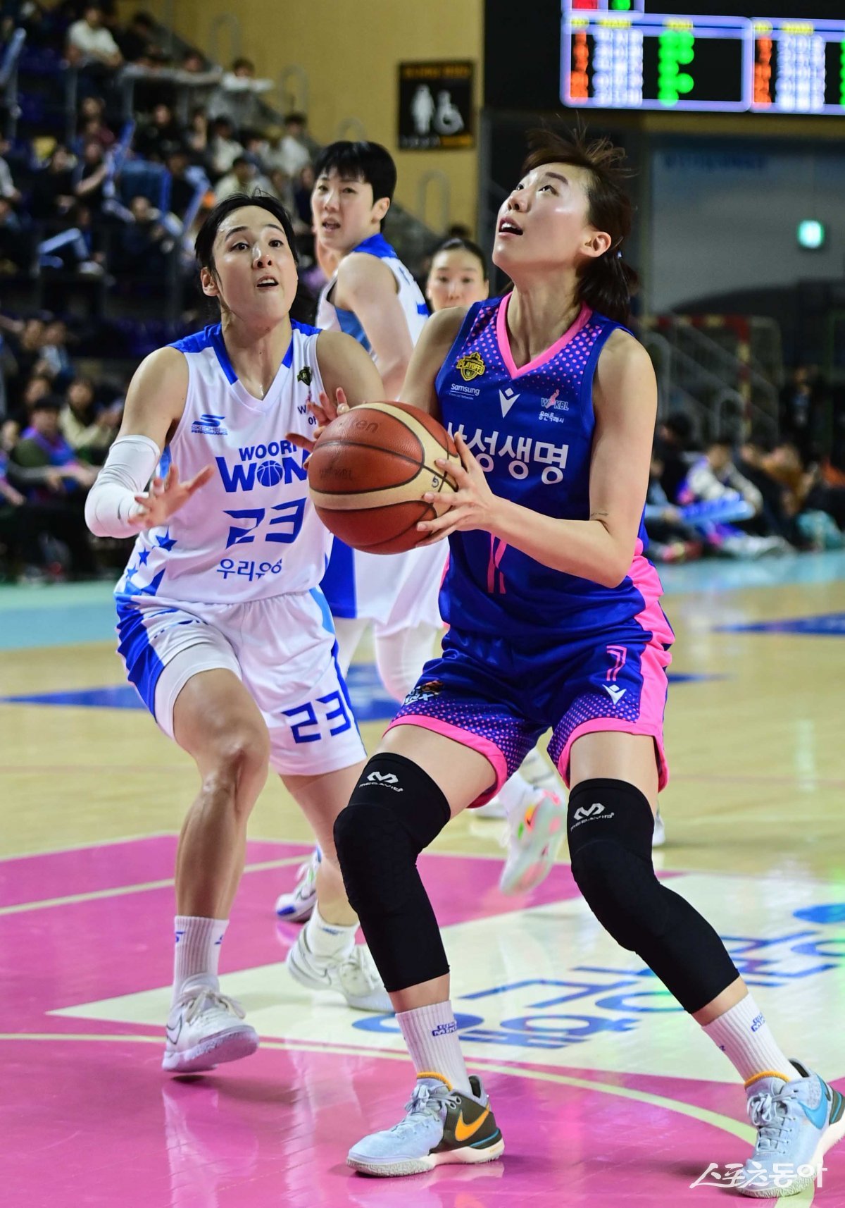 14일 경기도 용인실내체육관에서 열린 ‘우리은행 우리WON 2023-2024 여자프로농구’ 4강 플레이오프 3차전 용인 삼성생명과 아산 우리은행의 경기에서 삼성생명 강유림이 우리은행 김단비의 수비를 뚫고 슛을 하고 있다.