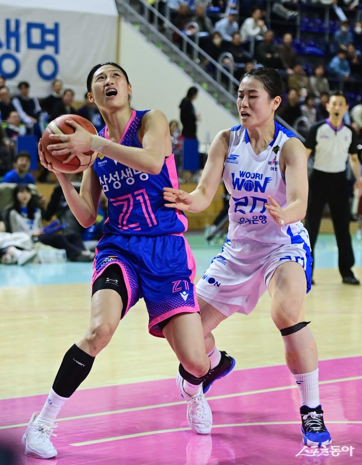 14일 경기도 용인실내체육관에서 열린 ‘우리은행 우리WON 2023-2024 여자프로농구’ 4강 플레이오프 3차전 용인 삼성생명과 아산 우리은행의 경기에서 삼성생명 이해란이 우리은행 이명관의 수비를 뚫고 슛을 하고 있다.
