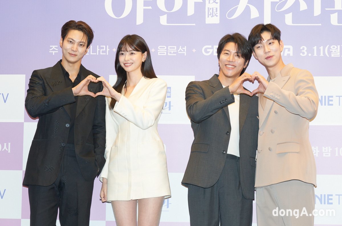 주원, 권나라, 음문석, 유인수가 11일 서울 마포구 스탠포드 호텔 코리아 그랜드볼룸에서 진행된 지니TV 오리지널 ‘야한(夜限) 사진관’ 제작발표회에서 포즈를 취하고 있다.