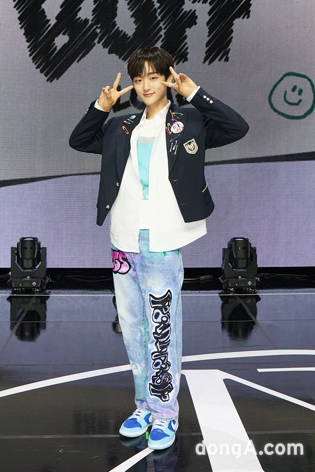 루네이트(LUN8) 진수가 13일 서울 광진구 예스24라이브홀에서 진행된 두 번째 미니앨범 ‘BUFF’ 발매 기념 쇼케이스에서 포즈를 취하고 있다.