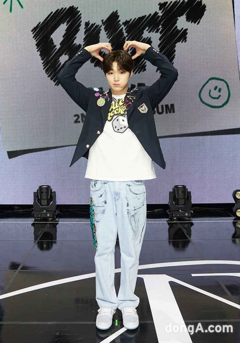 루네이트(LUN8) 은섭이 13일 서울 광진구 예스24라이브홀에서 진행된 두 번째 미니앨범 ‘BUFF’ 발매 기념 쇼케이스에서 포즈를 취하고 있다.