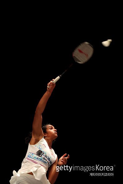 푸살라 신두(인도·세계랭킹 11위)가 14일(현지시간) 영국 버밍엄에서 열린 전영오픈 여자 단식 16강전 안세영(세계랭킹 1위)과의 경기에서 플레이 하고 있다.