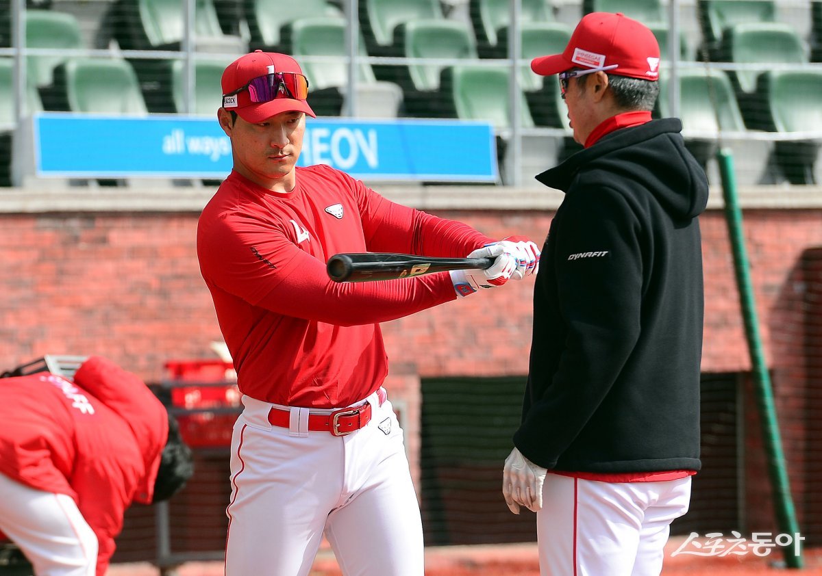 17일 인천 SSG 랜더스필드에서 ‘2024 신한 SOL 뱅크 KBO리그’ SSG 랜더스와 두산 베어스의 시범경기가 열린다. 경기 전 SSG 하재훈이 강병식 코치의 타격 지도를 받고 있다.