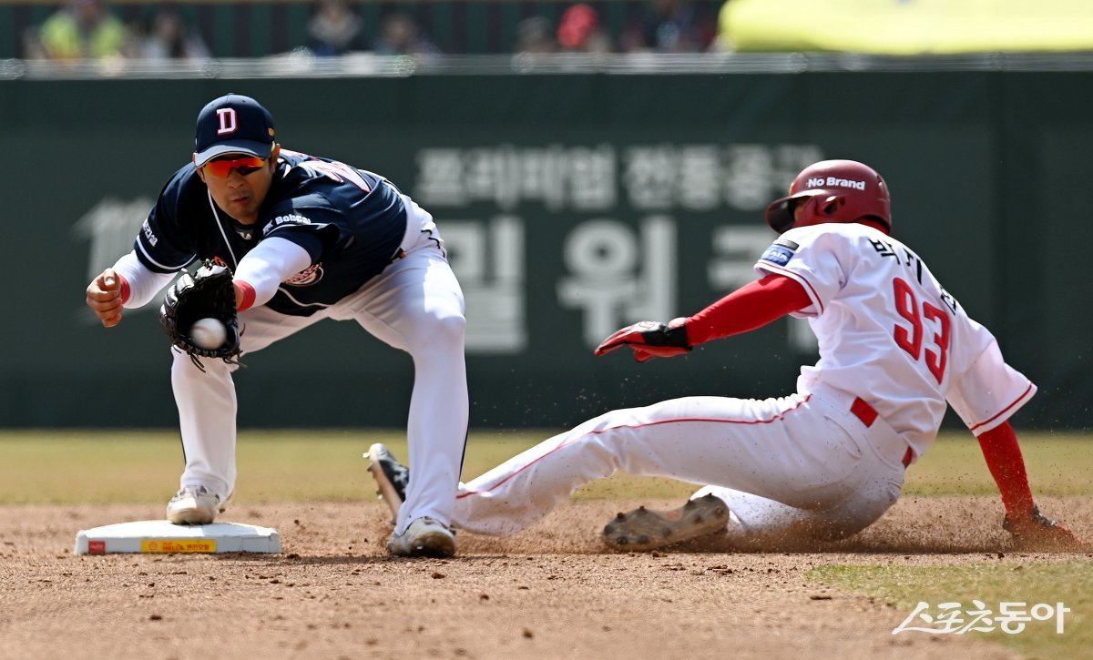 17일 인천 SSG 랜더스필드에서 ‘2024 신한 SOL 뱅크 KBO리그’ SSG 랜더스와 두산 베어스의 시범경기가 열렸다. 3회말 1사 1루에서 내야땅볼 때 두산 강승호가 2루에서 SSG 박지환을 포스 아웃시키고 있다.