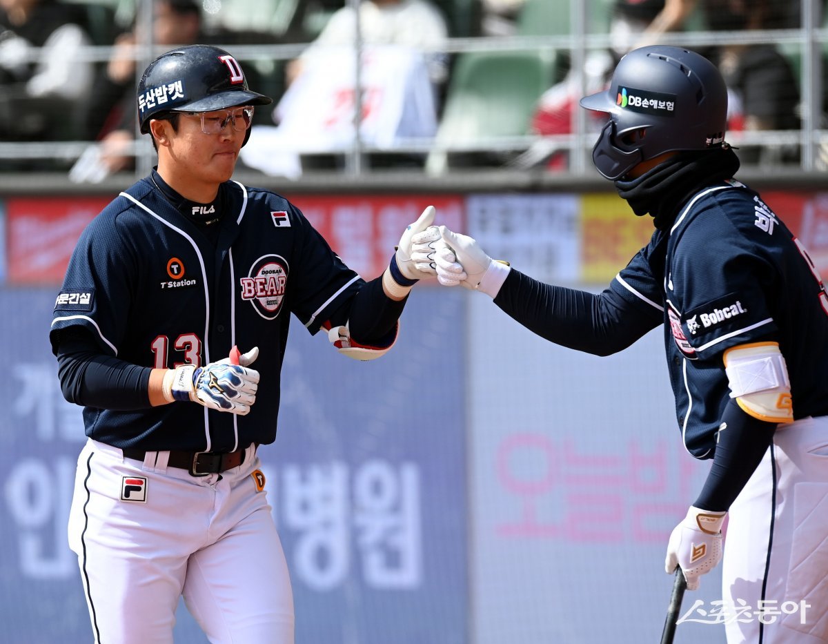 17일 인천 SSG 랜더스필드에서 ‘2024 신한 SOL 뱅크 KBO리그’ SSG 랜더스와 두산 베어스의 시범경기가 열렸다. 4회초 무사 1, 2루에서 두산 허경민이 3점 홈런을 쏘아 올린 후 동료의 환영을 받고 있다.