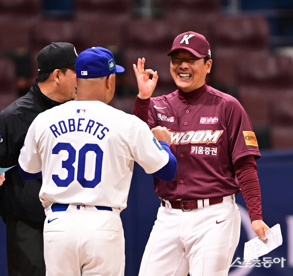 17일 서울 고척스카이돔에서 열린 ‘메이저리그 월드투어 서울시리즈 2024’ 스페셜 매치 키움 히어로즈와 LA 다저스의 경기에 앞서 LA 데이브 로버츠 감독과 키움 홍원기 감독이 이야기를 하고 있다.