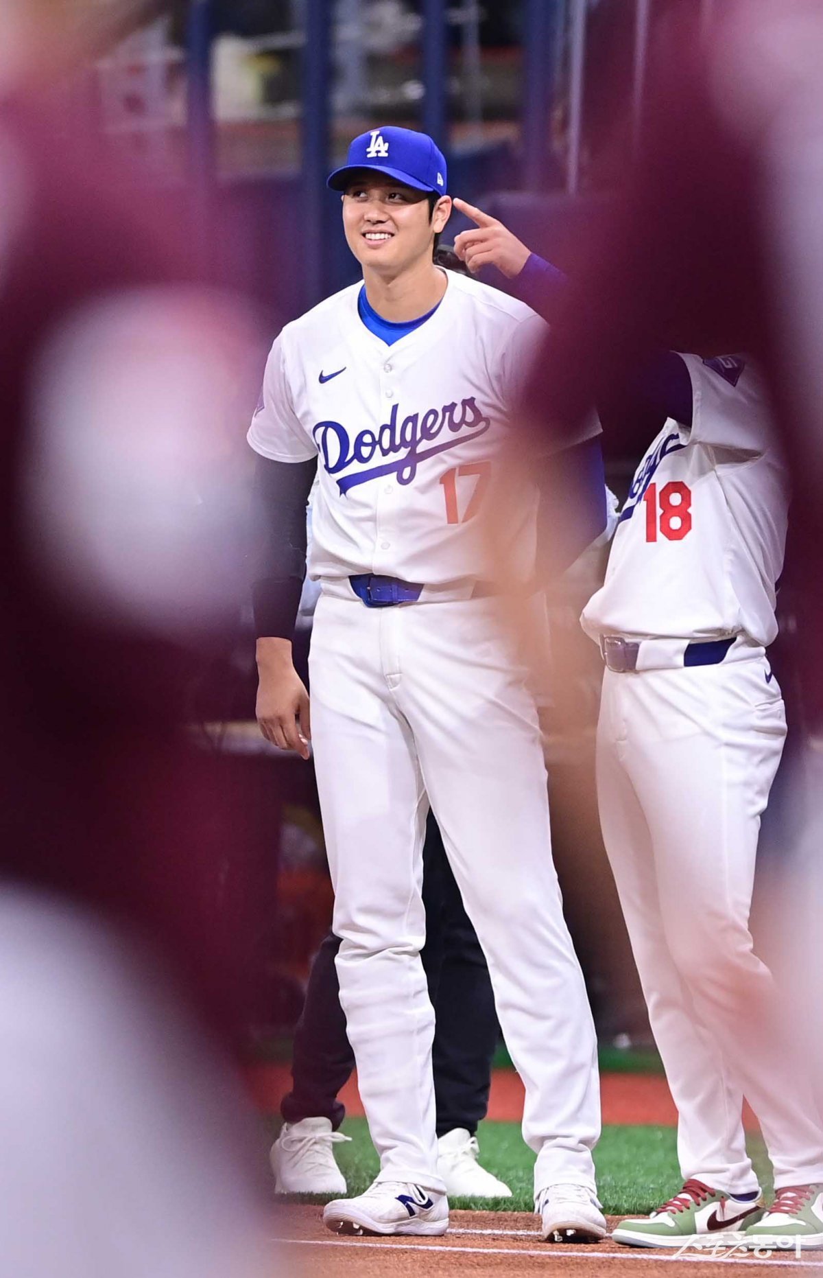 17일 서울 고척스카이돔에서 열린 ‘메이저리그 월드투어 서울시리즈 2024’ 스페셜 매치 키움 히어로즈와 LA 다저스의 경기에서 LA 오타니가 동료와 이야기를 하고 있다.