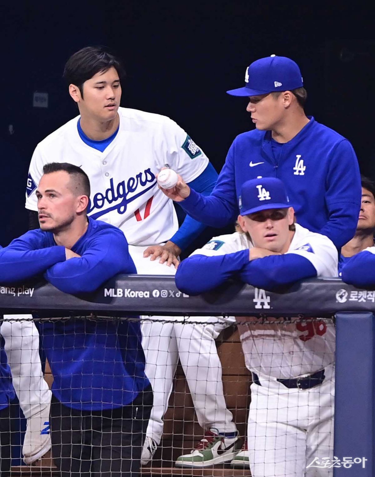 17일 서울 고척스카이돔에서 열린 ‘메이저리그 월드투어 서울시리즈 2024’ 스페셜 매치 키움 히어로즈와 LA 다저스의 경기에서 LA 오타니와 야마모토가 더그아웃에서 이야기를 하고 있다.