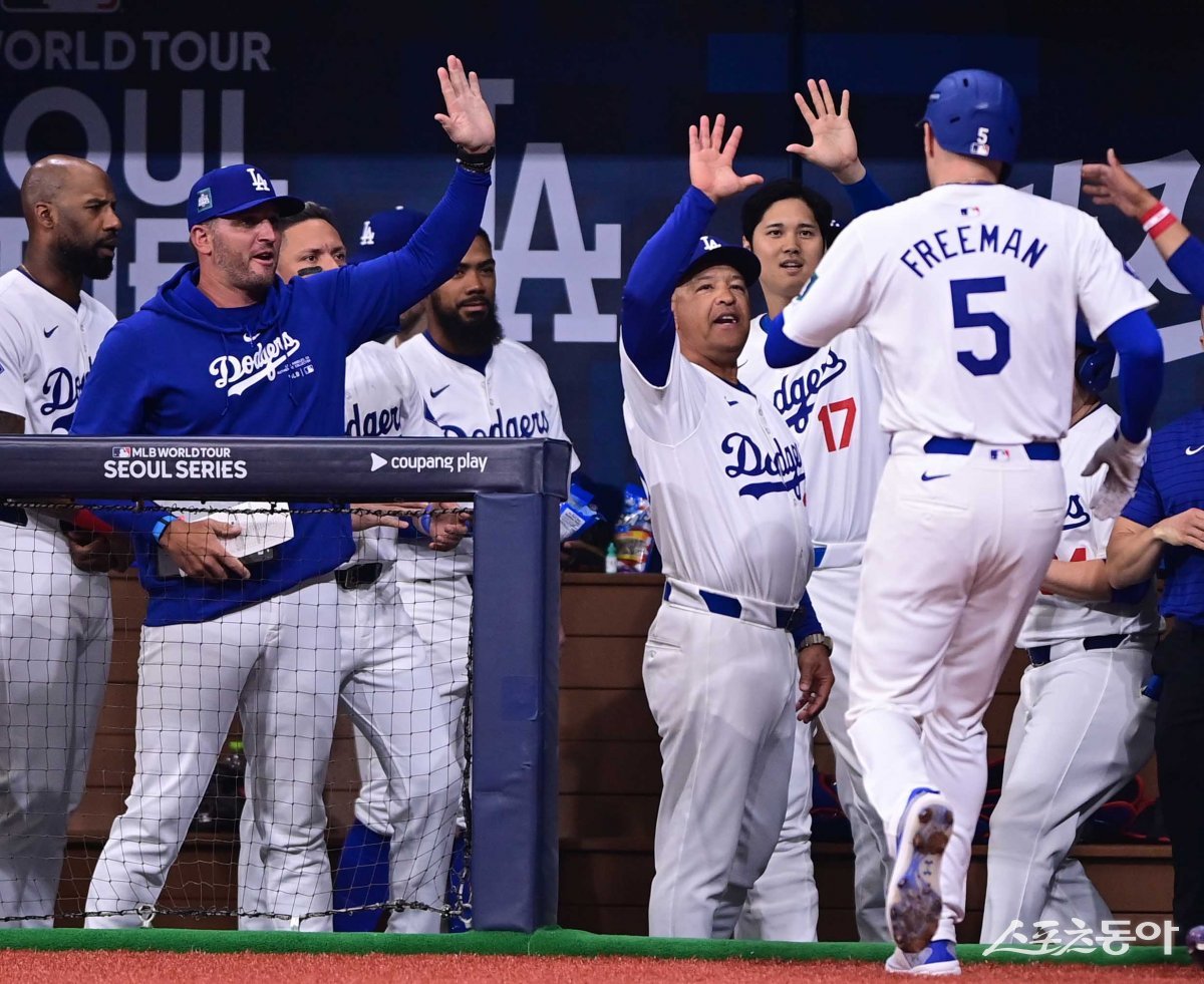 17일 서울 고척스카이돔에서 열린 ‘메이저리그 월드투어 서울시리즈 2024’ 스페셜 매치 키움 히어로즈와 LA 다저스의 경기에서 1회초 2사 LA 3번 타자 프레디 프리먼이 우월 솔로 홈런을 친 후 데이브 로버츠 감독의 축하를 받고 있다.