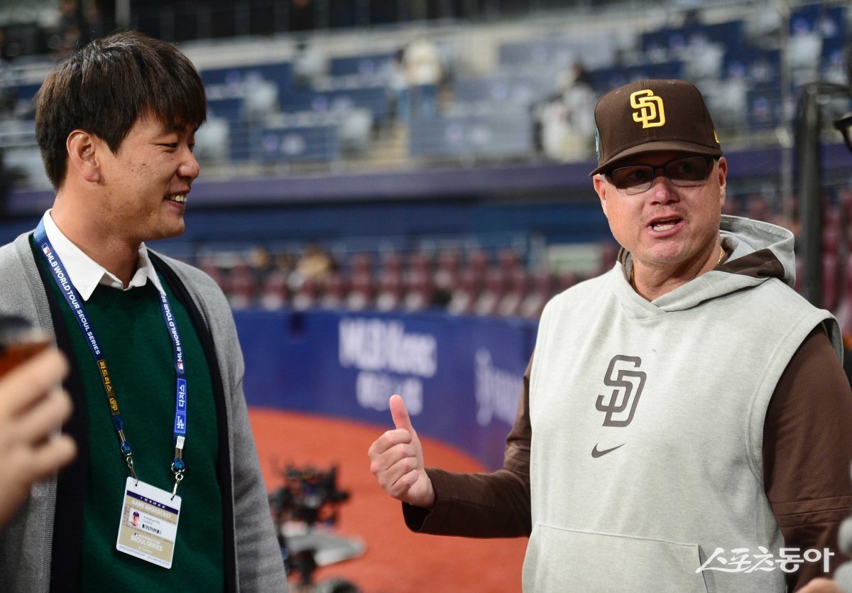 17일 서울 고척스카이돔에서 열린 ‘메이저리그 월드투어 서울시리즈 2024’ 스페셜 매치 팀 코리아와 샌디에이고 파드리스의 경기에 앞서 샌디에이고 마이크 실트 감독과 SSG 김광현이 인사하고 있다.
