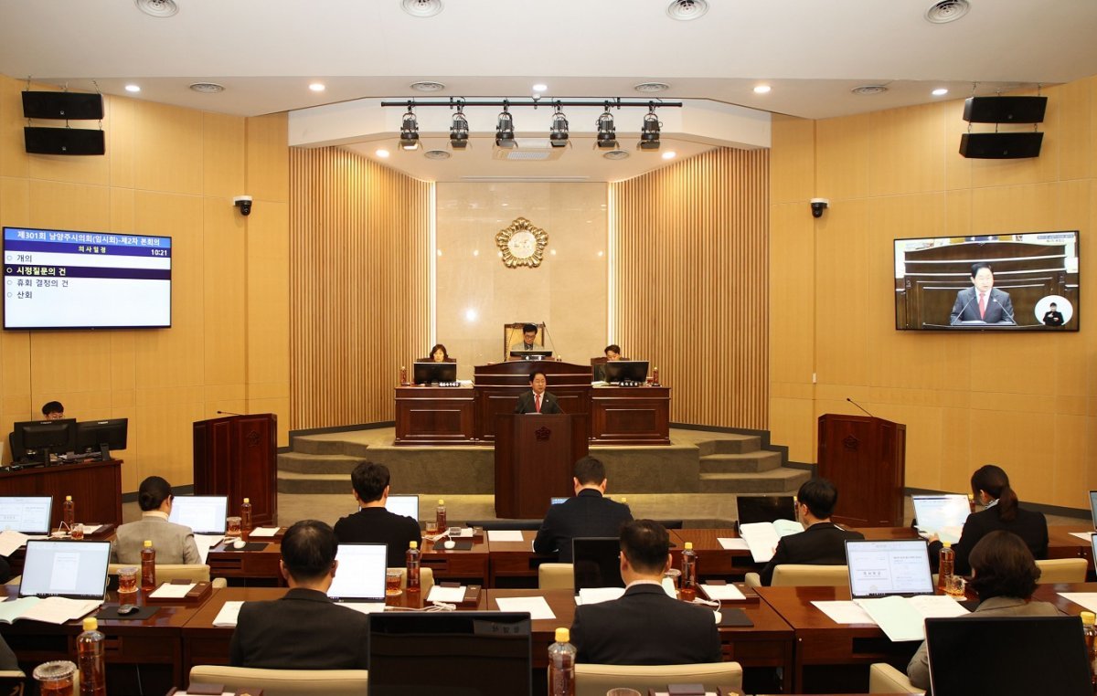 주광덕 남양주시장은 지난 14일과 15일 이틀간 열린 제301회 남양주시의회 임시회 제1·2차 본회의에서 시의원들의 시정 질문에 답변하고 있다. 사진제공ㅣ남양주시