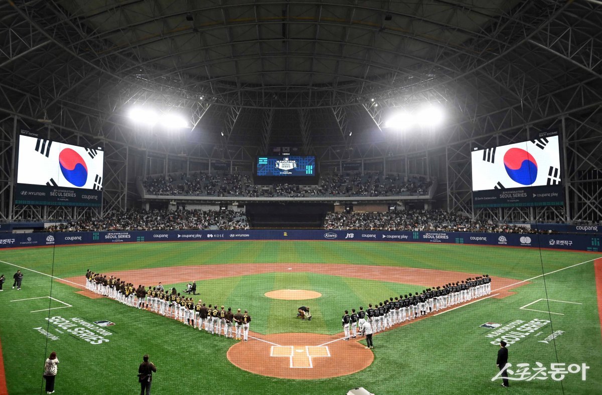 17일 서울 고척스카이돔에서 열린 ‘메이저리그 월드투어 서울시리즈 2024’ 스페셜 매치 팀 코리아와 샌디에이고 파드리스의 경기에서 관중들과 팀 코리아 선수들이 애국가를 제창하고 있다.