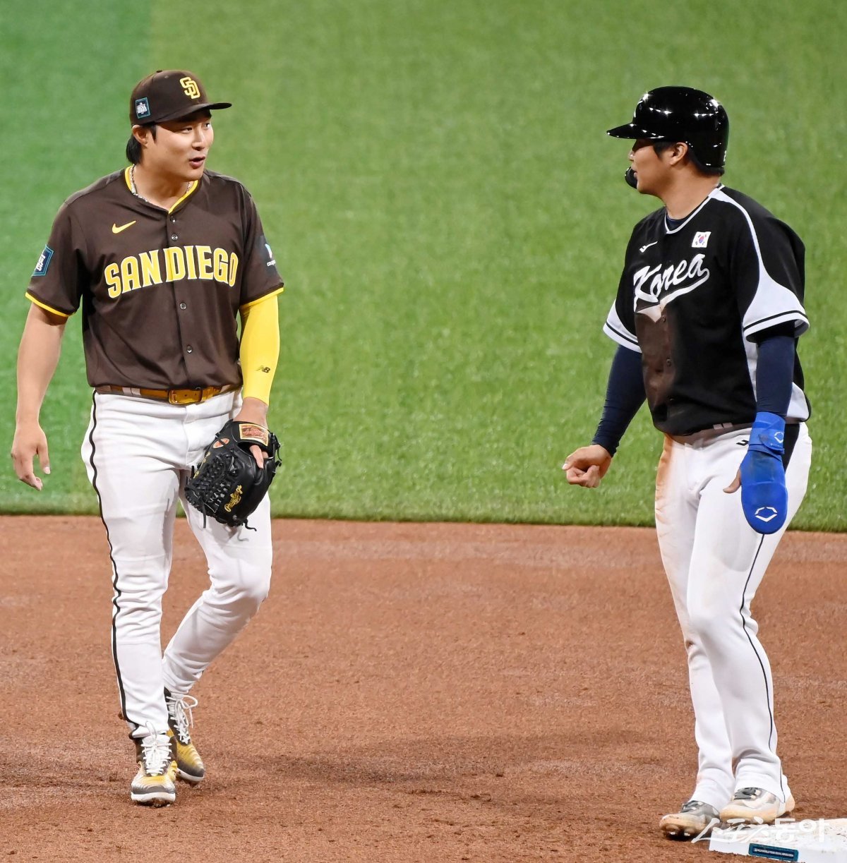 17일 서울 고척스카이돔에서 열린 ‘메이저리그 월드투어 서울시리즈 2024’ 스페셜 매치 팀 코리아와 샌디에이고 파드리스의 경기에서 2회초 1사 1루 상황에서 도루에 성공한 팀 코리아 문보경과 샌디에이고 김하성이 이야기를 하고 있다.
