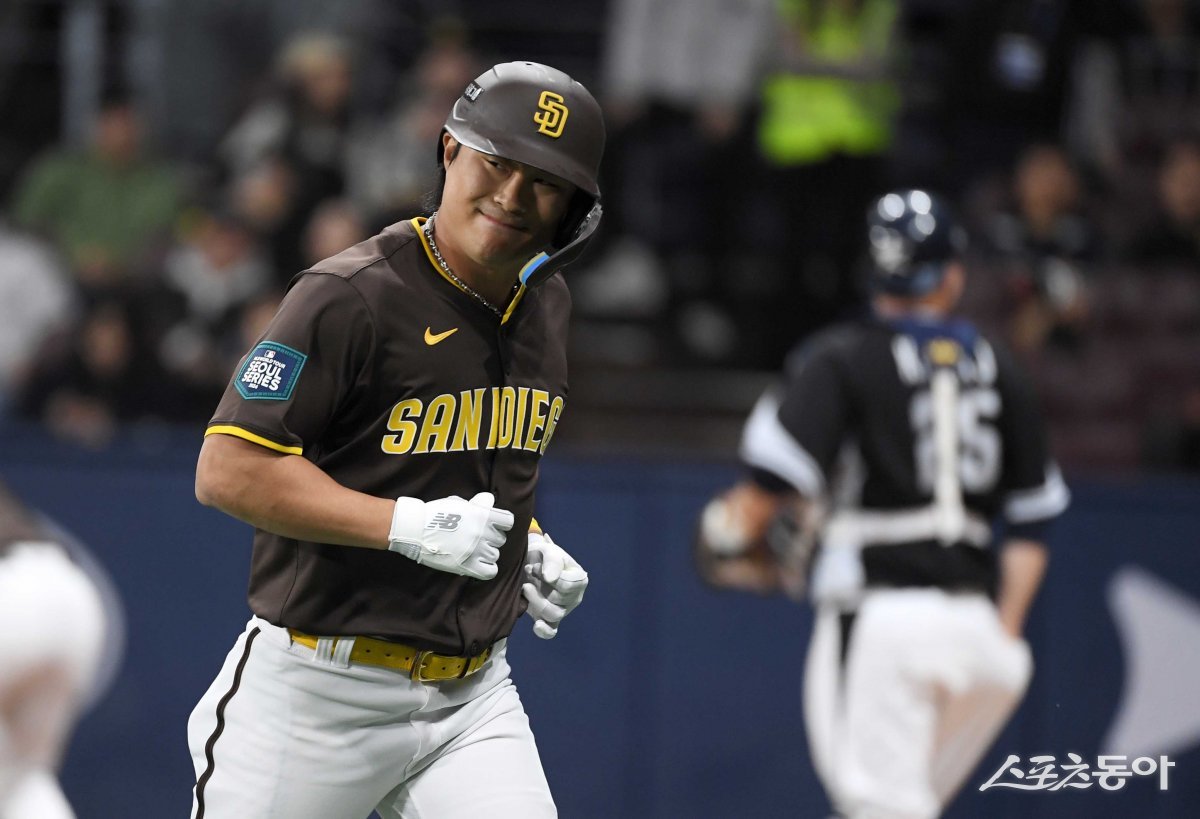 17일 서울 고척스카이돔에서 열린 ‘메이저리그 월드투어 서울시리즈 2024’ 스페셜 매치 팀 코리아와 샌디에이고 파드리스의 경기에서 1회말 1사 만루 샌디에이고 김하성이 뜬공으로 아웃되며 아쉬워하고 있다.