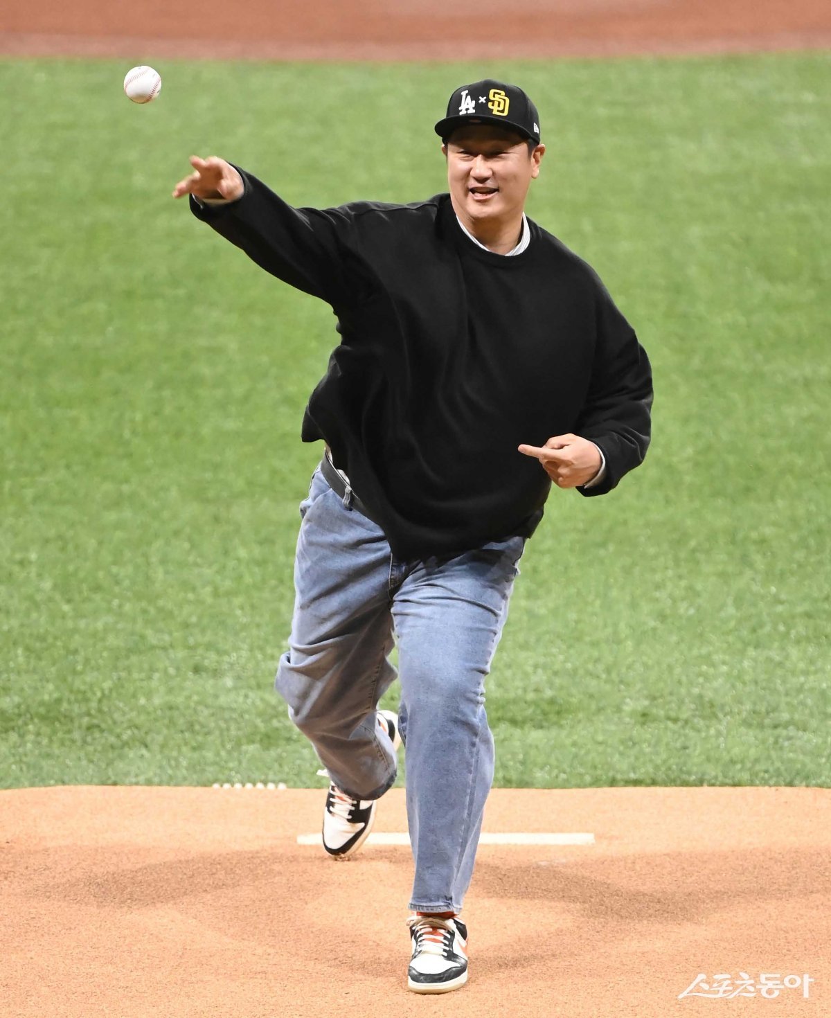 17일 서울 고척스카이돔에서 열린 ‘메이저리그 월드투어 서울시리즈 2024’ 스페셜 매치 팀 코리아와 샌디에이고 파드리스의 경기에서 전 야구 선수 이대호가 시구를 하고 있다.
