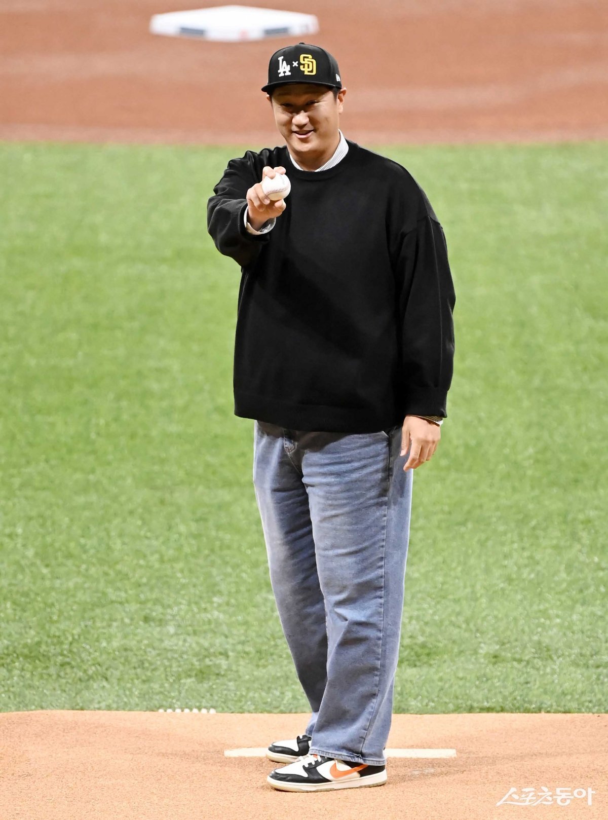 17일 서울 고척스카이돔에서 열린 ‘메이저리그 월드투어 서울시리즈 2024’ 스페셜 매치 팀 코리아와 샌디에이고 파드리스의 경기에서 전 야구 선수 이대호가 시구를 하고 있다.