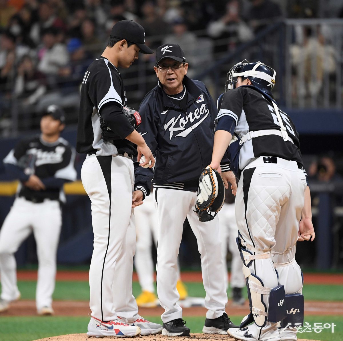 17일 서울 고척스카이돔에서 열린 ‘메이저리그 월드투어 서울시리즈 2024’ 스페셜 매치 팀 코리아와 샌디에이고 파드리스의 경기에서 1회말 무사 만루 상황에서 팀 코리아 문동주가 최일언 코치와 이야기를 하고 있다.