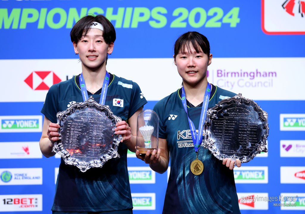 이소희(왼쪽)-백하나가 17일(한국시간) 영국 버밍엄 유틸리타 아레나에서 막을 내린 2024전영오픈 배드민턴 여자복식에서 우승한 뒤 트로피를 들고 미소 짓고 있다. 사진=게티이미지코리아