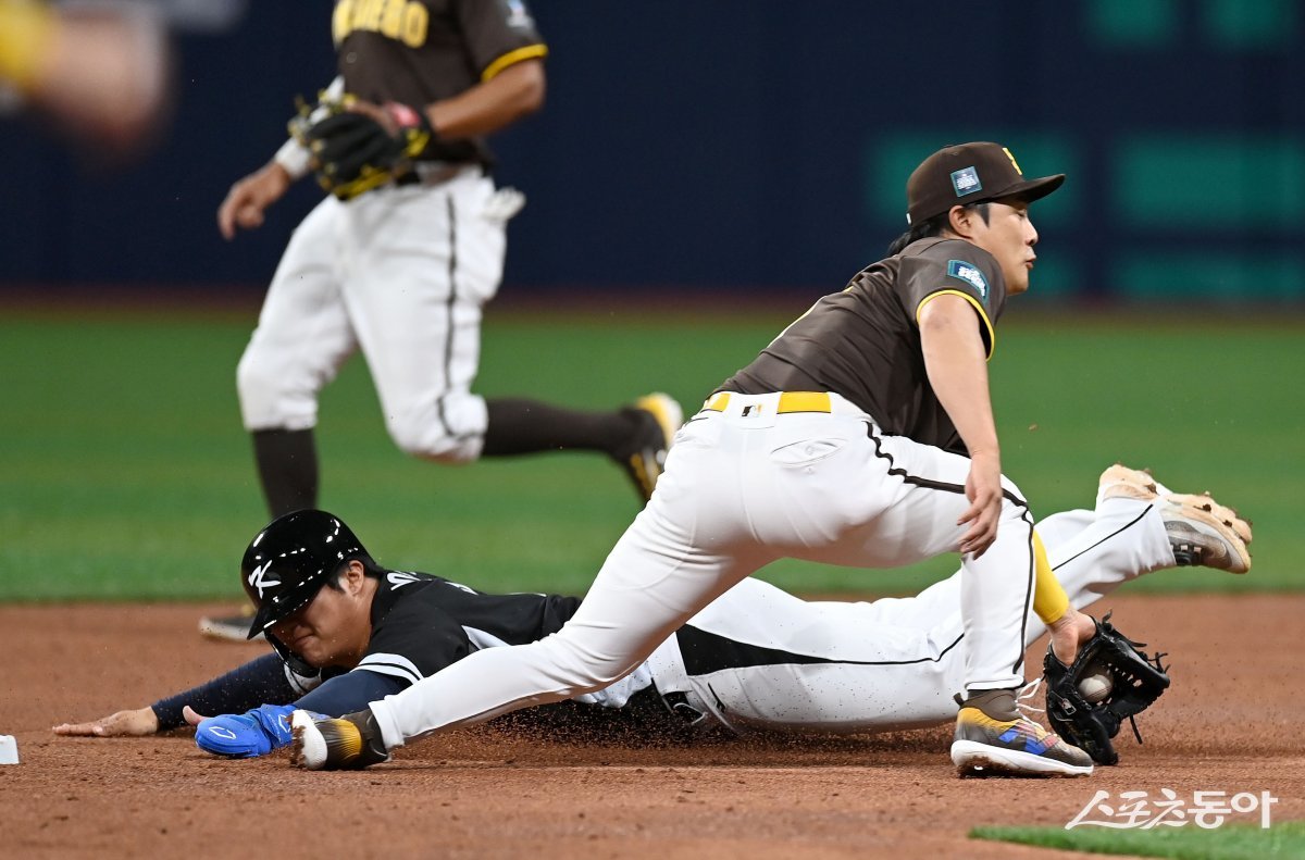 17일 서울 고척스카이돔에서 열린 ‘메이저리그 월드투어 서울시리즈 2024’ 스페셜 매치 팀코리아와 샌디에이고 파드리스의 경기에 열렸다. 2회초 무사 1루 팀코리아 삼진 아웃 때 1루주자 문보경이 2루 도루에 성공하고 있다.