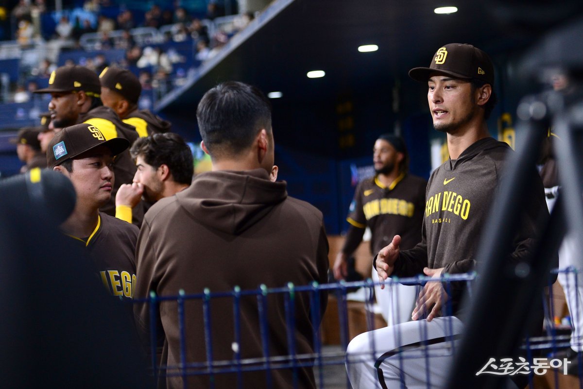 17일 서울 고척스카이돔에서 열린 ‘메이저리그 월드투어 서울시리즈 2024’ 스페셜 매치 팀코리아와 샌디에이고 파드리스의 경기에 열렸다. 샌디에이고 고우석이 더그아웃에서 다르빗슈 유와 이야기하고 있다.
