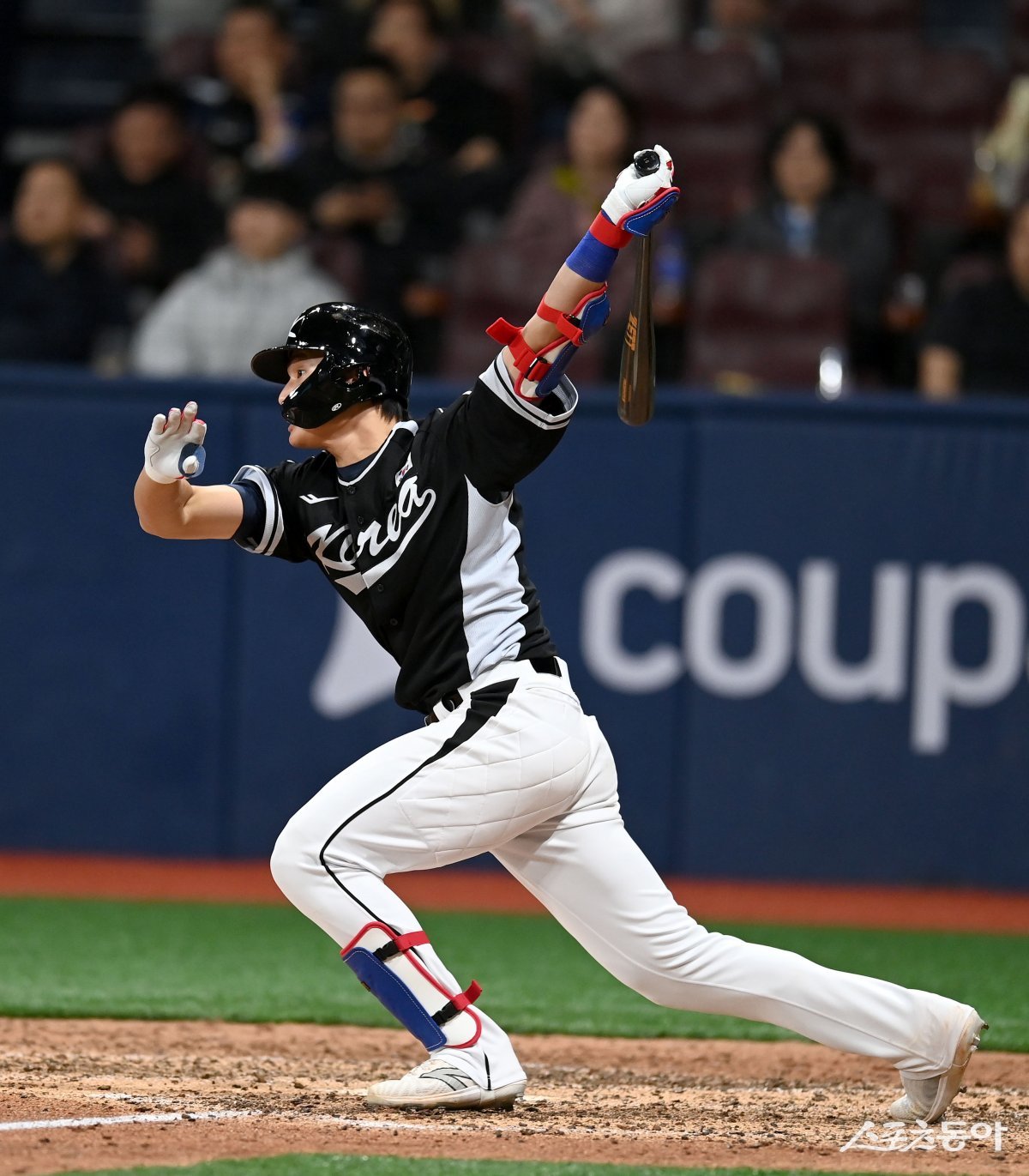 17일 서울 고척스카이돔에서 열린 ‘메이저리그 월드투어 서울시리즈 2024’ 스페셜 매치 팀코리아와 샌디에이고 파드리스의 경기에 열렸다. 8회초 2사 1루 팀코리아 윤동희가 중전 안타를 치고 있다.
