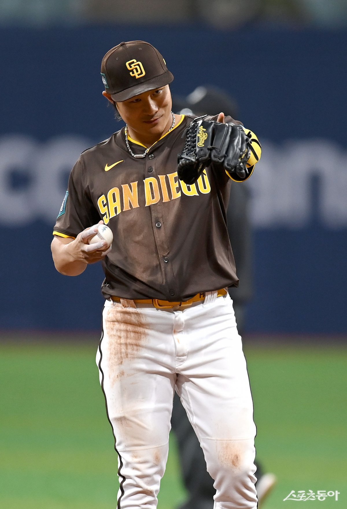 17일 서울 고척스카이돔에서 열린 ‘메이저리그 월드투어 서울시리즈 2024’ 스페셜 매치 팀코리아와 샌디에이고 파드리스의 경기에 열렸다. 샌디에이고 김하성이 팀 동료의 호수비에 손짓하고 있다.