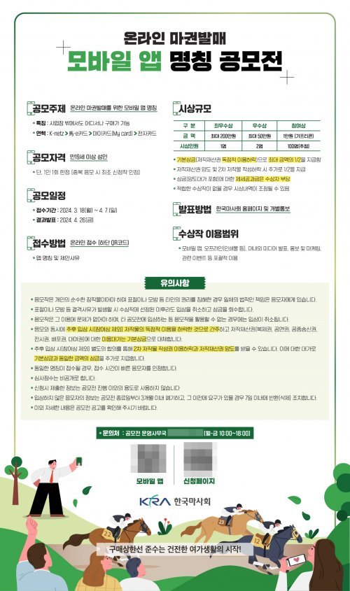 한국마사회(회장 정기환)는 4월 7일까지 ‘온라인 마권발매 모바일 앱 명칭 공모전’을 진행한다.