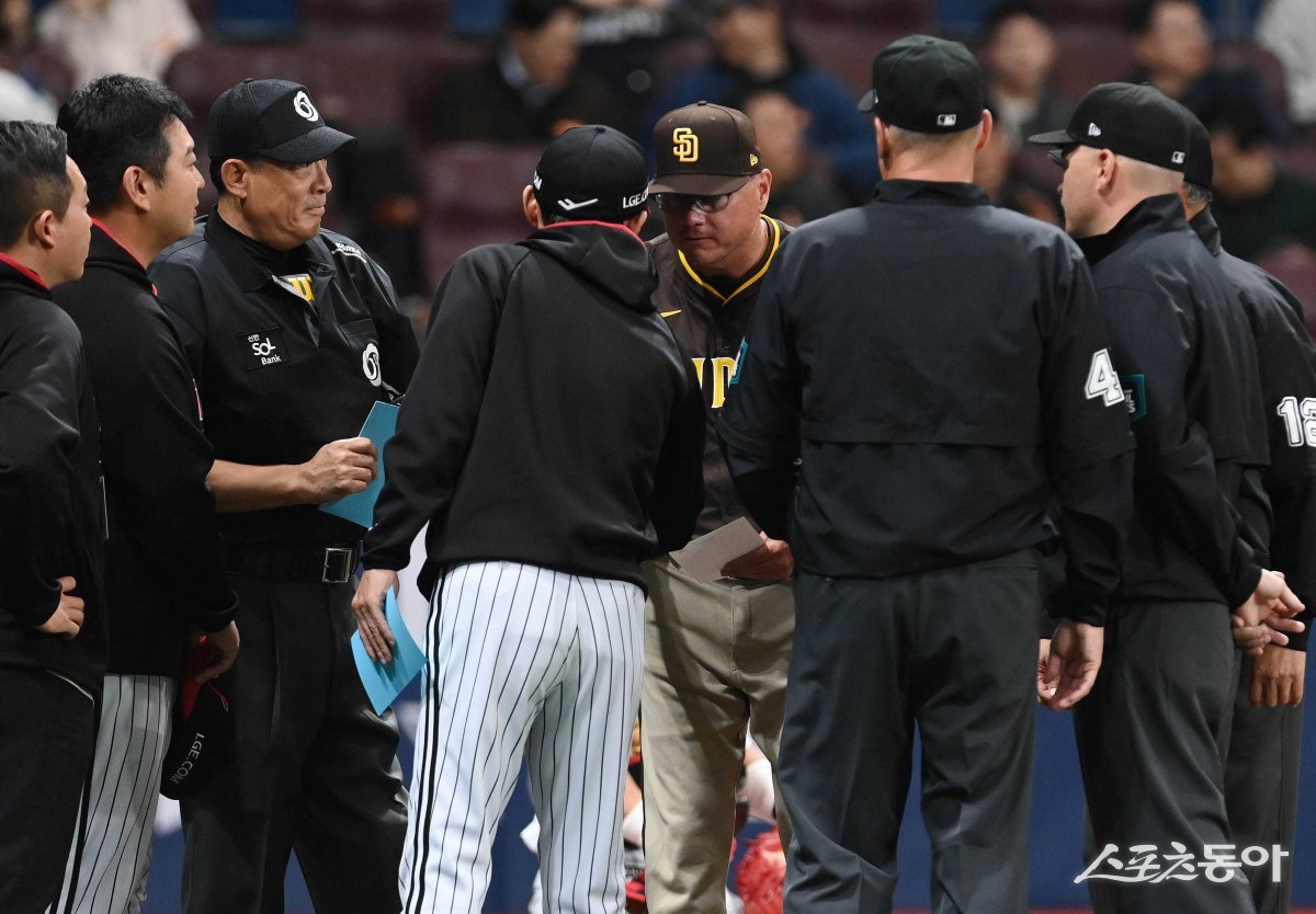 18일 서울 고척스카이돔에서 열린 ‘메이저리그 월드투어 서울시리즈 2024’ 스페셜 매치 샌디에이고 파드리스 LG 트윈스의 경기에 앞서 샌디에이고 마이크 실트 감독이 LG 감독과 인사하고 있다.
