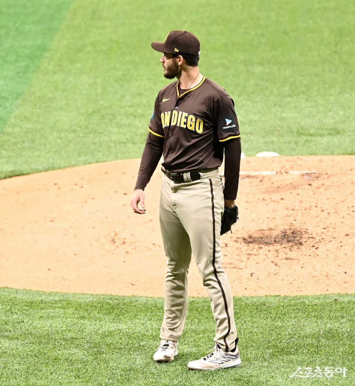 18일 서울 고척스카이돔에서 열린 ‘메이저리그 월드투어 서울시리즈 2024’ 스페셜 매치 샌디에이고 파드리스 LG 트윈스의 경기에서 2회말 1사 샌디에이고 딜런 시즈가 LG에 홈런을 허용한 후 아쉬워하고 있다.