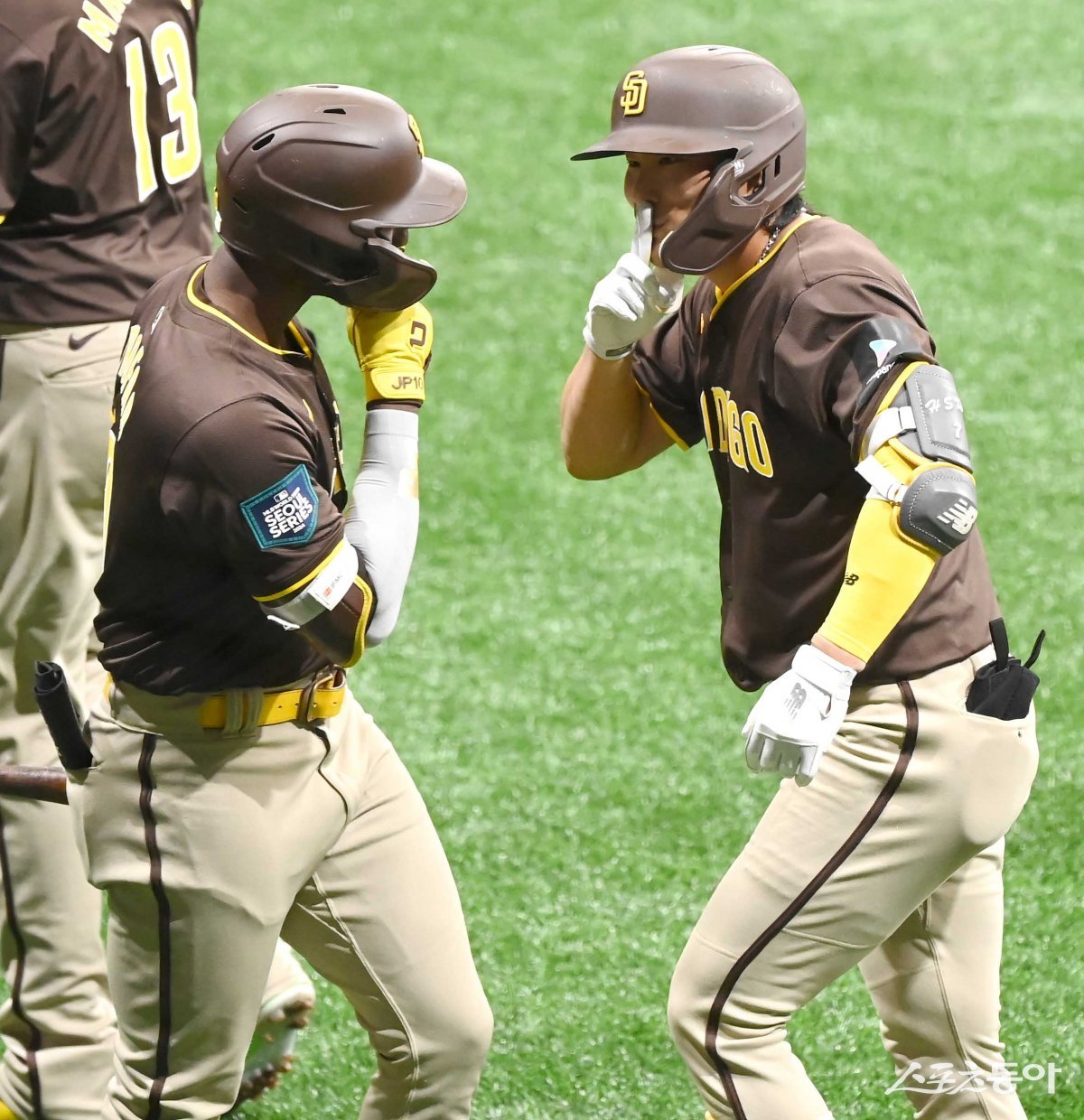 18일 서울 고척스카이돔에서 열린 ‘메이저리그 월드투어 서울시리즈 2024’ 스페셜 매치 샌디에이고 파드리스 LG 트윈스의 경기에서 2회초 무사 2루 샌디에이고 김하성이 좌월 투런 홈런을 친 후 세리머니를 하고 있다.