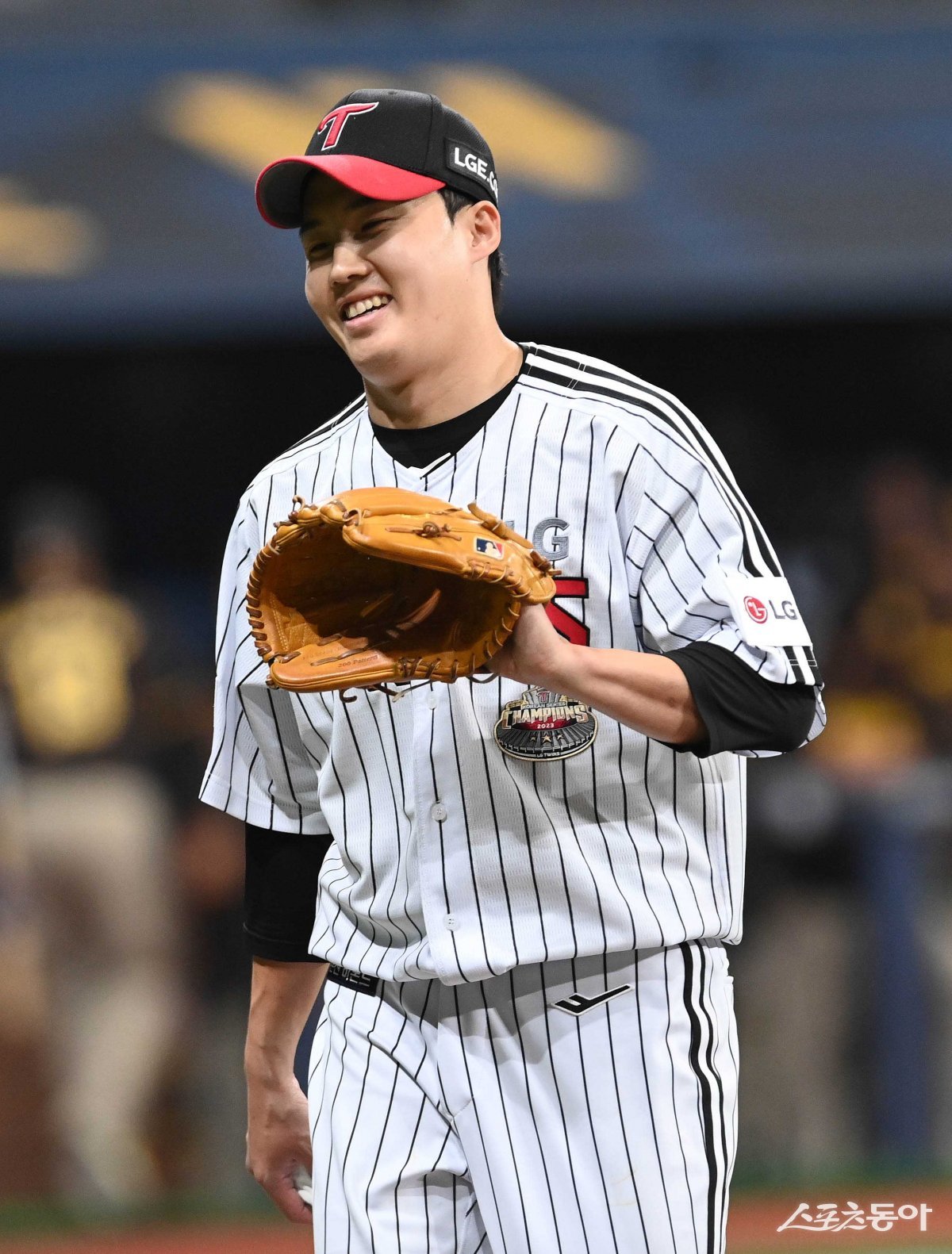 18일 서울 고척스카이돔에서 열린 ‘메이저리그 월드투어 서울시리즈 2024’ 스페셜 매치 샌디에이고 파드리스 LG 트윈스의 경기에서 1회초 수비를 마친 LG 임찬규가 기뻐하고 있다.