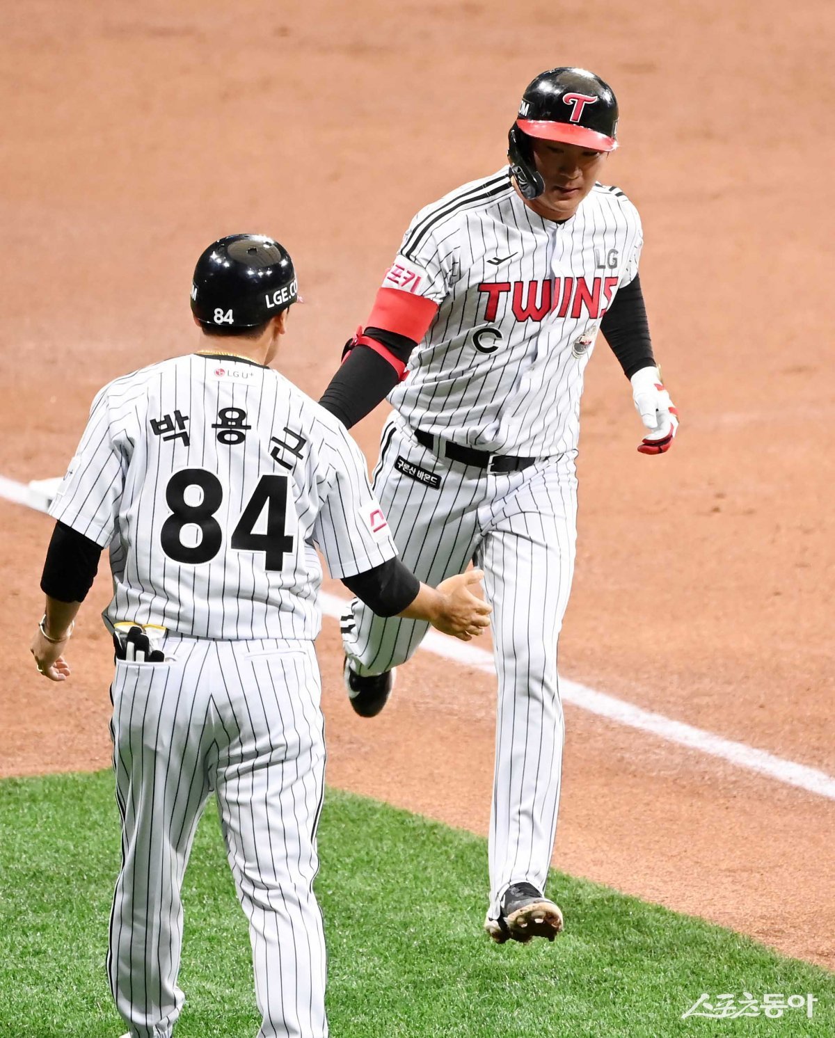 18일 서울 고척스카이돔에서 열린 ‘메이저리그 월드투어 서울시리즈 2024’ 스페셜 매치 샌디에이고 파드리스 LG 트윈스의 경기에서 2회말 1사 LG 오지환이 솔로 홈런을 친 후 3루코치와 기쁨을 나누고 있다.