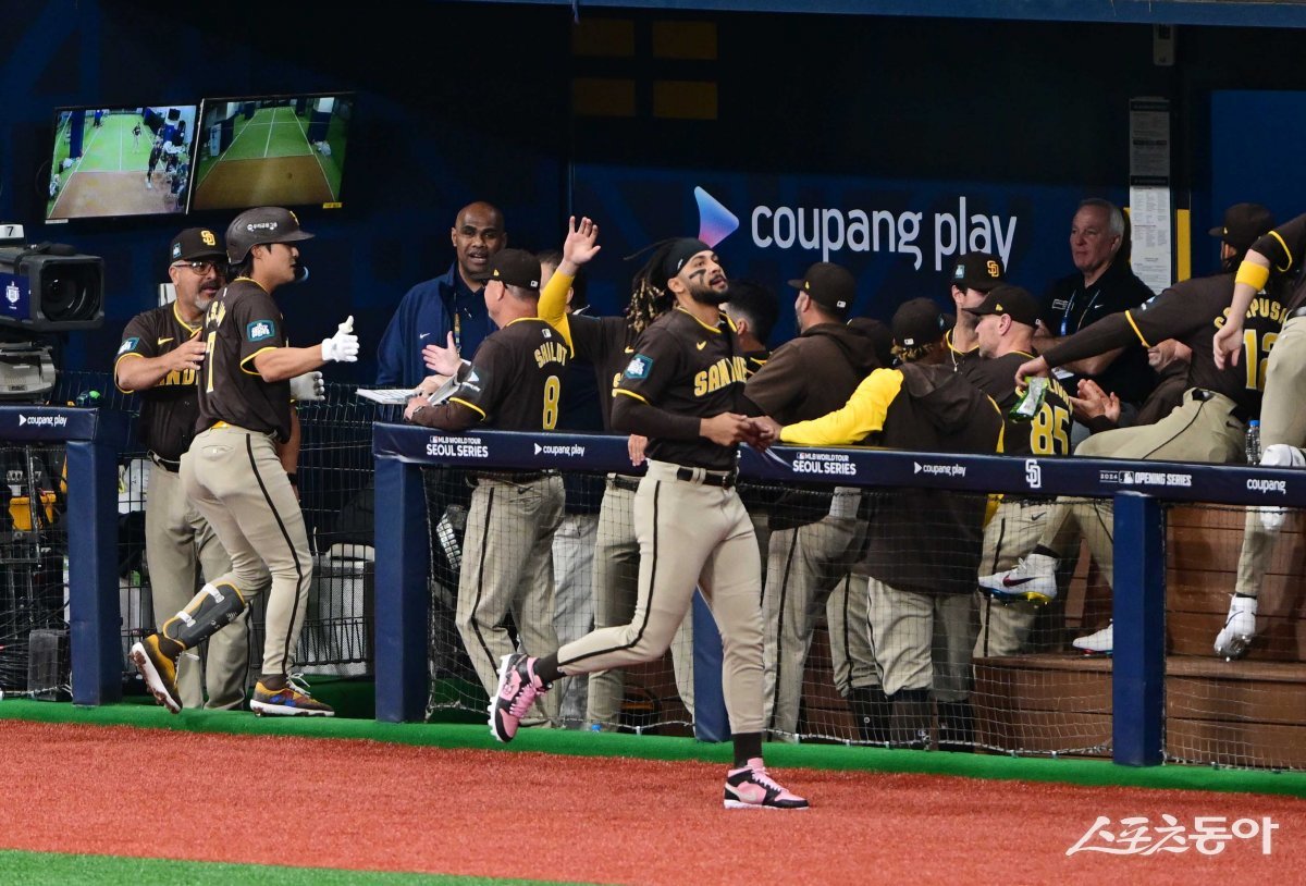 18일 서울 고척스카이돔에서 열린 ‘메이저리그 월드투어 서울시리즈 2024’ 스페셜 매치 샌디에이고 파드리스 LG 트윈스의 경기에서 2회초 무사 2루 샌디에이고 김하성이 좌월 투런 홈런을 친 후 더그아웃에서 동료들의 축하를 받고 있다.