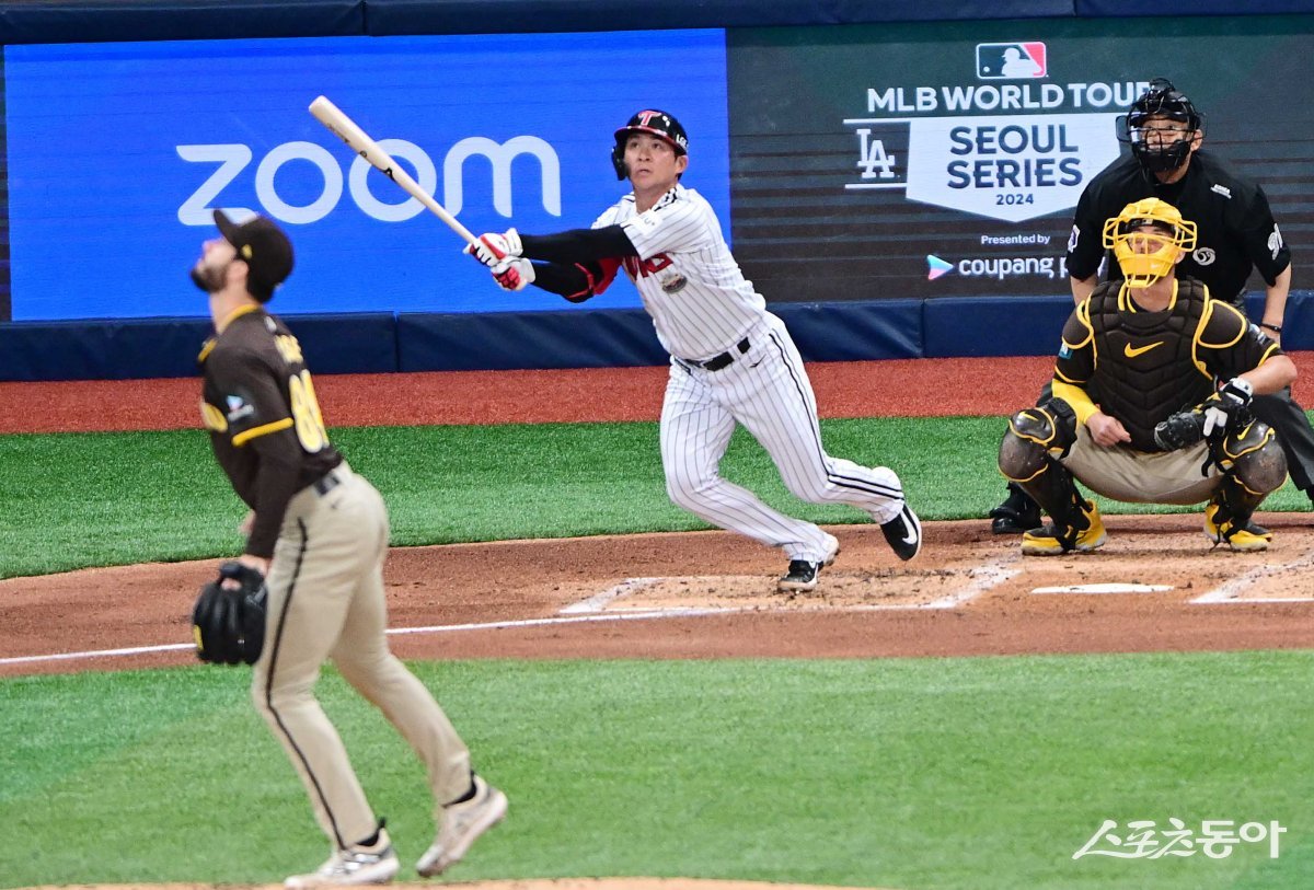 18일 서울 고척스카이돔에서 열린 ‘메이저리그 월드투어 서울시리즈 2024’ 스페셜 매치 샌디에이고 파드리스 LG 트윈스의 경기에서 2회말 1사 LG 오지환이 솔로 홈런을 치고 있다.