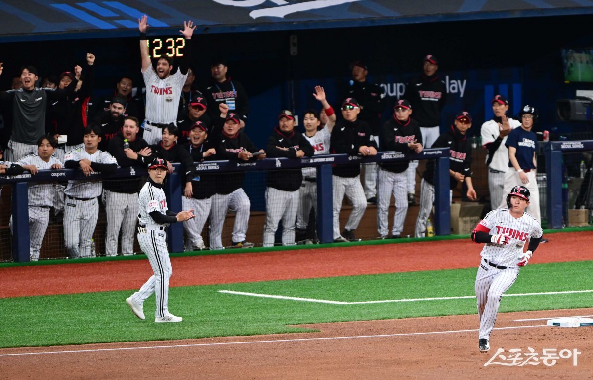 18일 서울 고척스카이돔에서 열린 ‘메이저리그 월드투어 서울시리즈 2024’ 스페셜 매치 샌디에이고 파드리스 LG 트윈스의 경기에서 2회말 1사 LG 오지환이 솔로 홈런을 치고 있다.