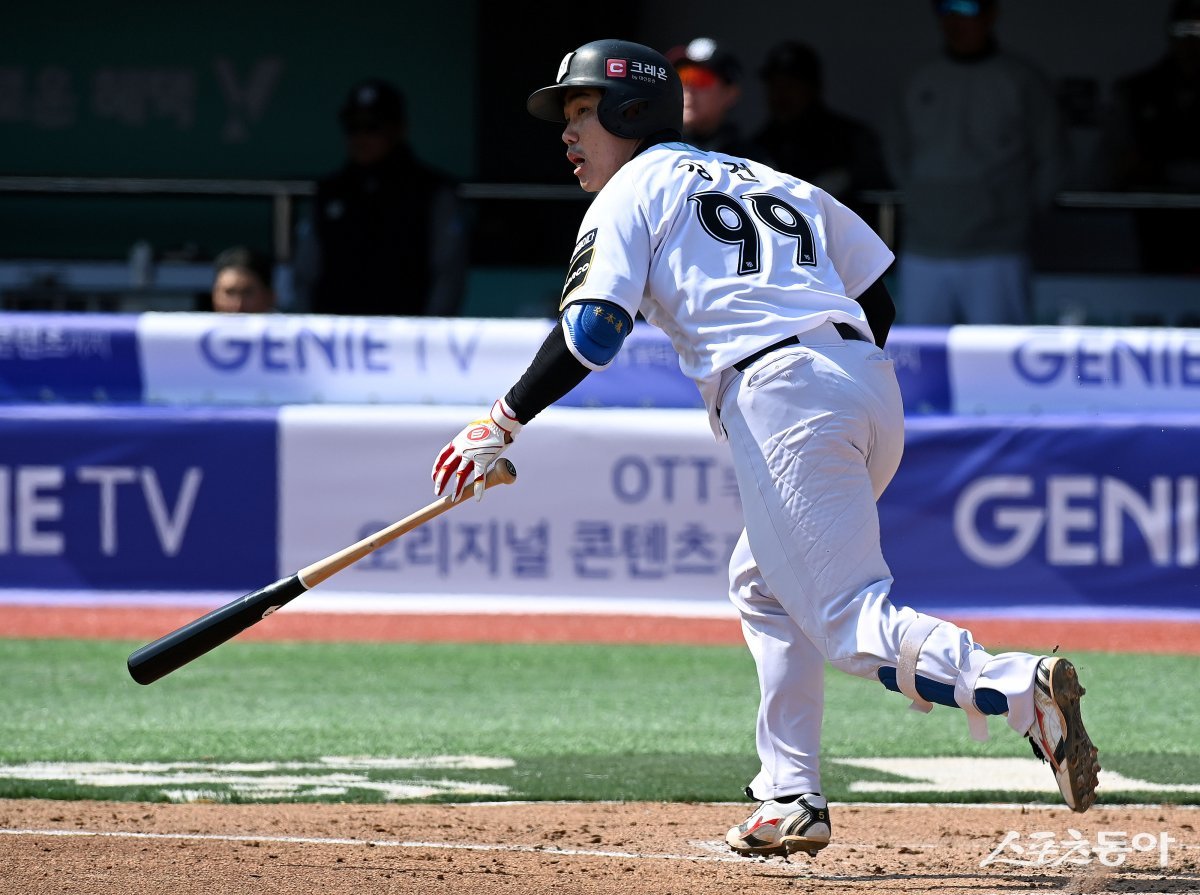18일 경기도 수원 KT위즈파크에서 ‘2024 신한 SOL 뱅크 KBO리그’ KT 위즈와 롯데 자이언츠의 시범경기가 열렸다. 3회말 무사 1루에서 KT 신본기가 안타를 날리고 있다.