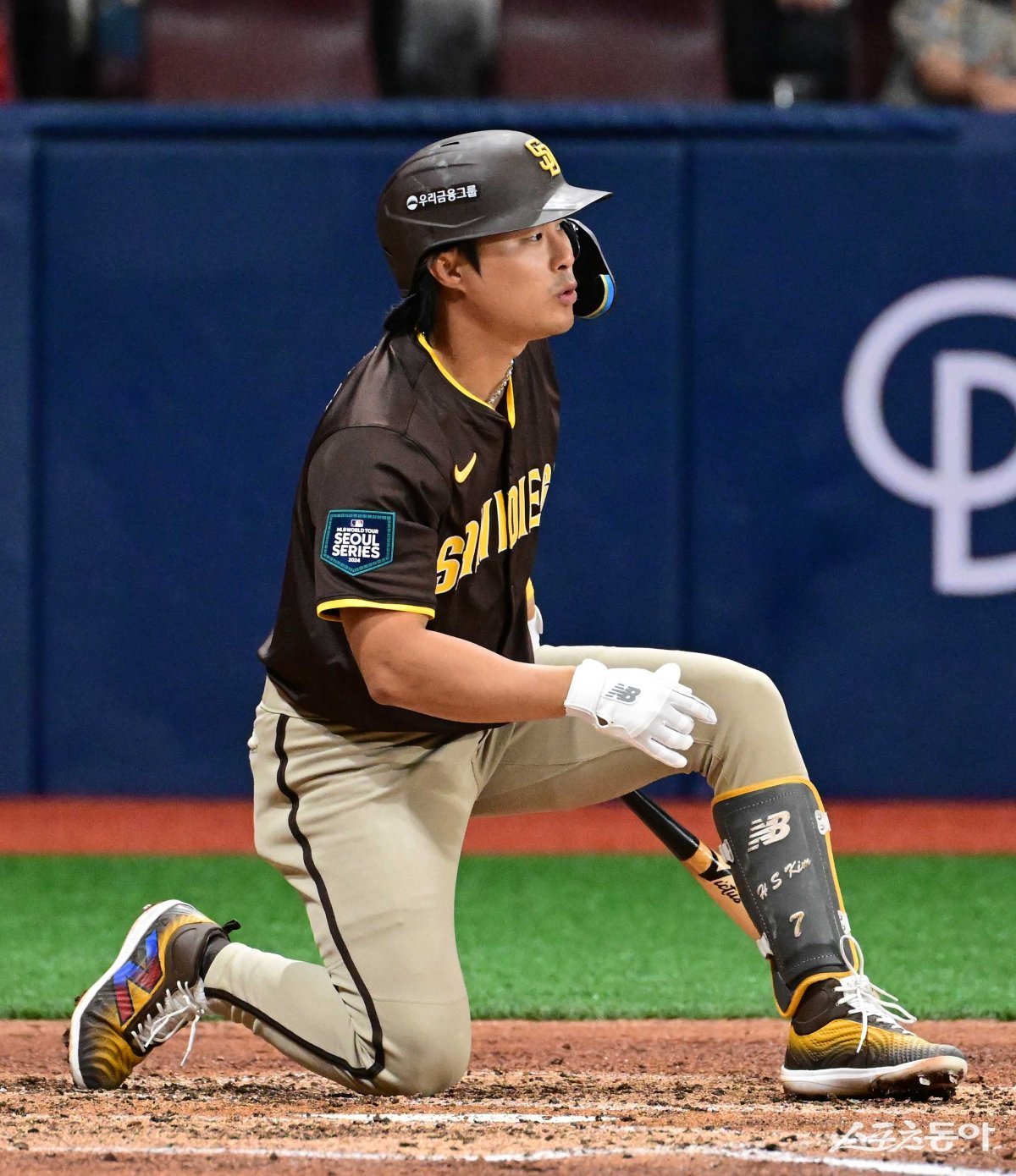 18일 서울 고척스카이돔에서 열린 ‘메이저리그 월드투어 서울시리즈 2024’ 스페셜 매치 샌디에이고 파드리스 LG 트윈스의 경기에서 4회초 샌디에이고 김하성이 삼진을 당한 후 아쉬워하고 있다.