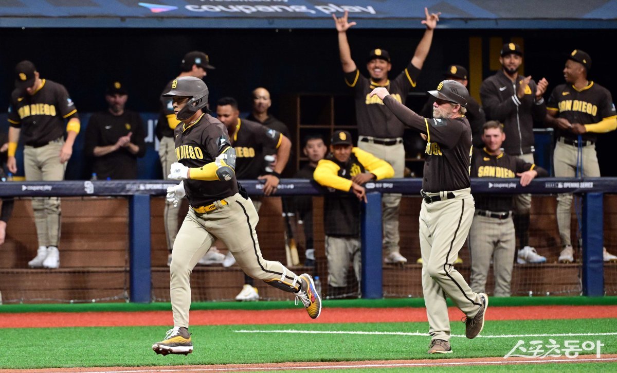 18일 서울 고척스카이돔에서 열린 ‘메이저리그 월드투어 서울시리즈 2024’ 스페셜 매치 샌디에이고 파드리스 LG 트윈스의 경기에서 6회초 1사 1루 샌디에이고 김하성이 투런 홈런을 친 후 그라운드를 돌고 있다. 고척 | 김종원 기자 won@donga.com