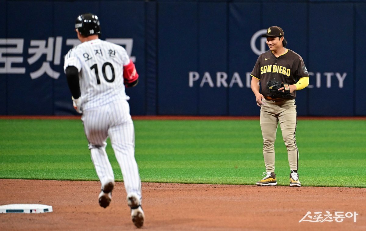 18일 서울 고척스카이돔에서 열린 ‘메이저리그 월드투어 서울시리즈 2024’ 스페셜 매치 샌디에이고 파드리스 LG 트윈스의 경기에서 2회말 1사 LG 오지환의 솔로포에 샌디에이고 김하성이 웃고 있다.