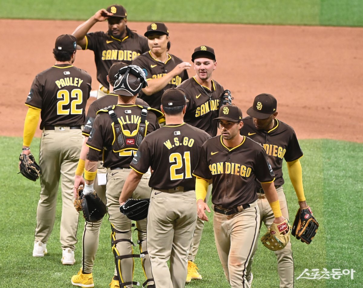 18일 서울 고척스카이돔에서 ‘메이저리그 월드투어 서울시리즈 2024’ 스페셜 매치 샌디에이고 파드리스와 LG 트윈스 경기가 열렸다. 5-4 승리를 거둔 샌디에이고 선수들이 하이파이브 하고 있다. 고척 | 김종원 기자 won@donga.com
